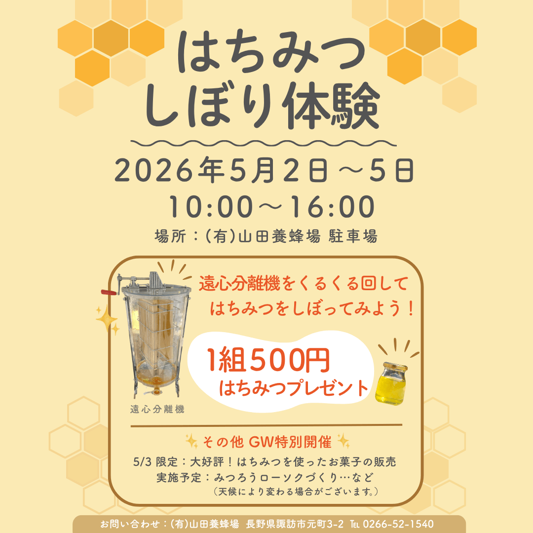 告知【GW限定イベント】はちみつしぼり体験実施 5月2日~5日まで!