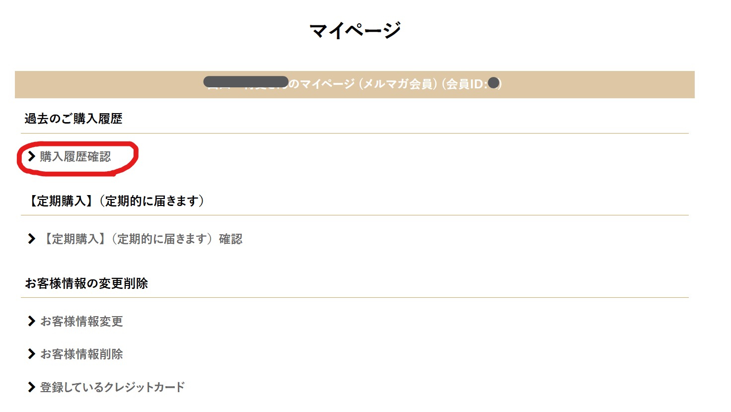 ①マイページを開いて、「購入履歴確認」をクリック
