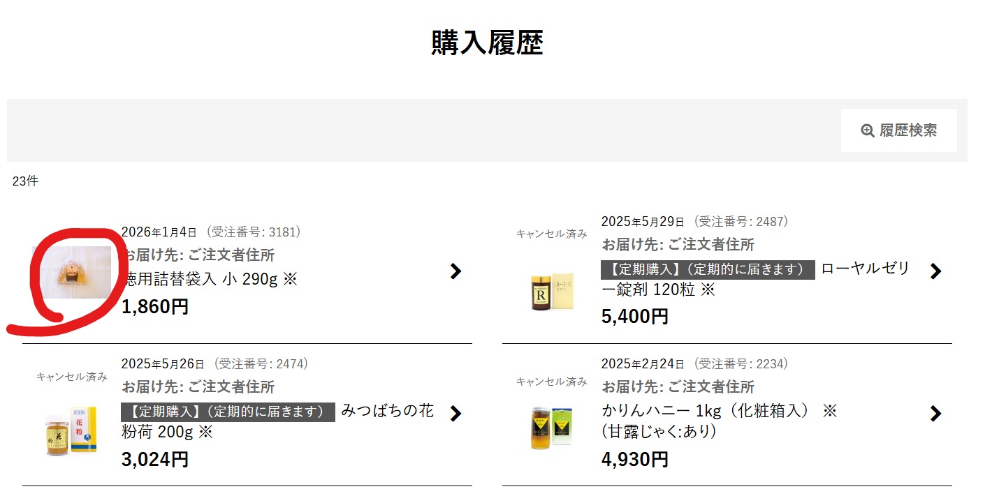 ②購入履歴を開き、商品を選んでください。