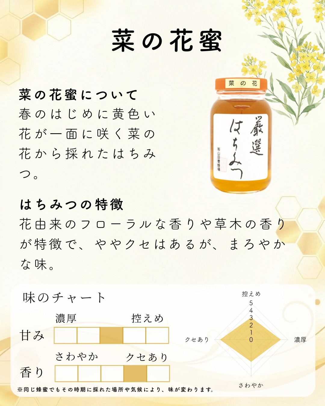 国産はちみつそれぞれの味や香りをまとめています。ご参考いただければ幸いです。国産はちみつ比較表.page 当店オリジナルのはちみつ利用法です。はちみつ利用法(PDFファイル)ぜひ、ご覧ください。 |